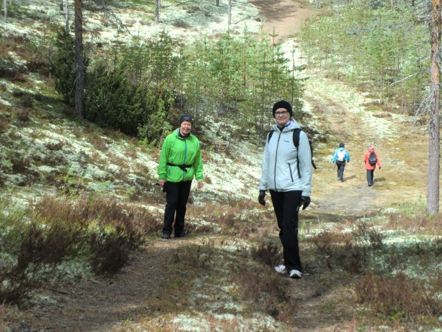 Supasta lähdimme sitten Oulun Latu ry:n Raimo Salon opastuksella vaellusreiteille pienoisessa vesisateessa. Mutta kävellessä ei kylmä tullut, ehkä päinvastoin, sadeviittojen alla 'dyynejä' ylös ja alas noustessa viitan alla alkoi olla ihan liiankin lämmintä. Maisema oli kaunista katseltavaa; jäkäläkankaita, mäntymetsää, suppia, jotka kertoivat hiekkaan hautautuneiden jäälohkareiden sijainnista. Suppien välissä olevat selänteet olivat hiekalla täyttyneitä tiloja.